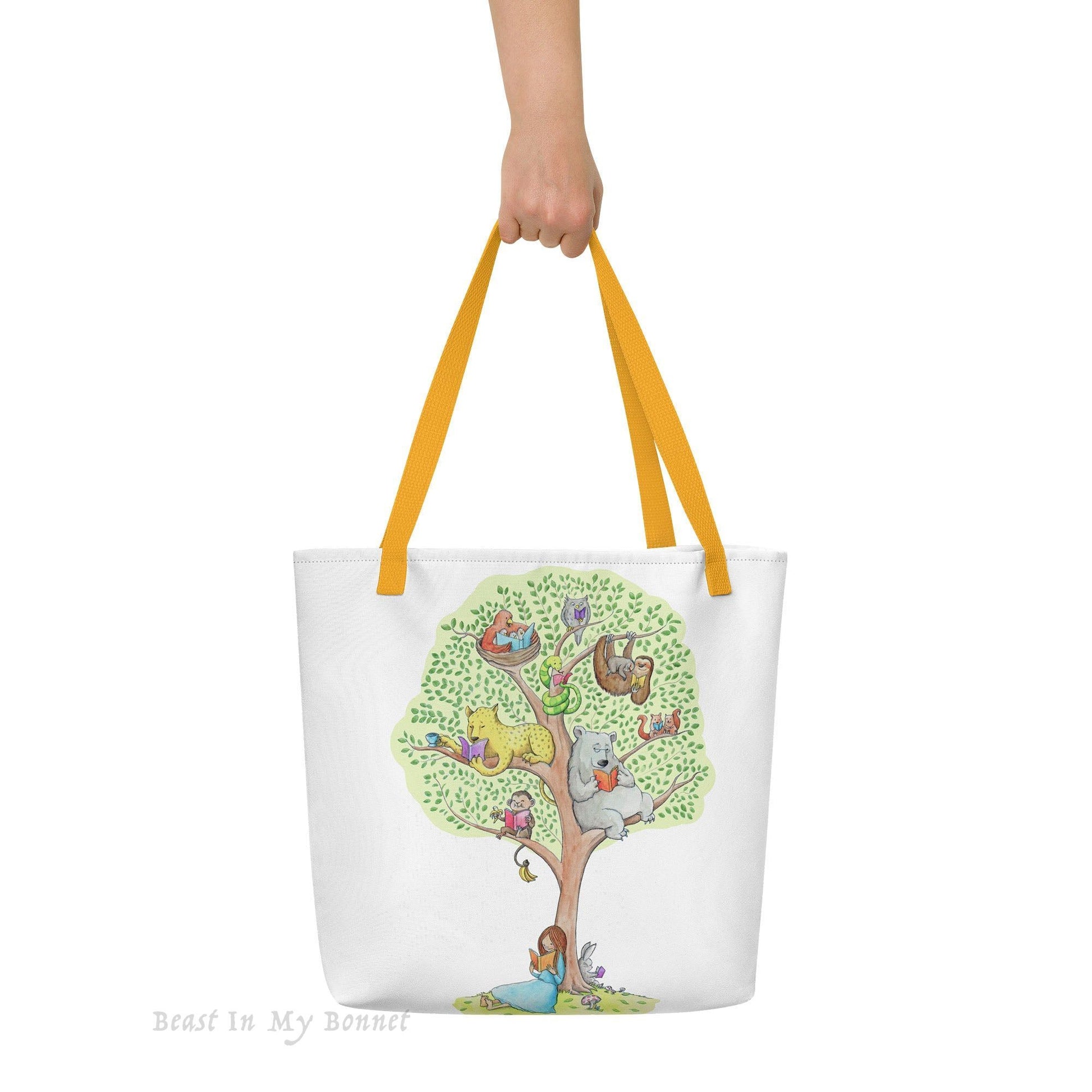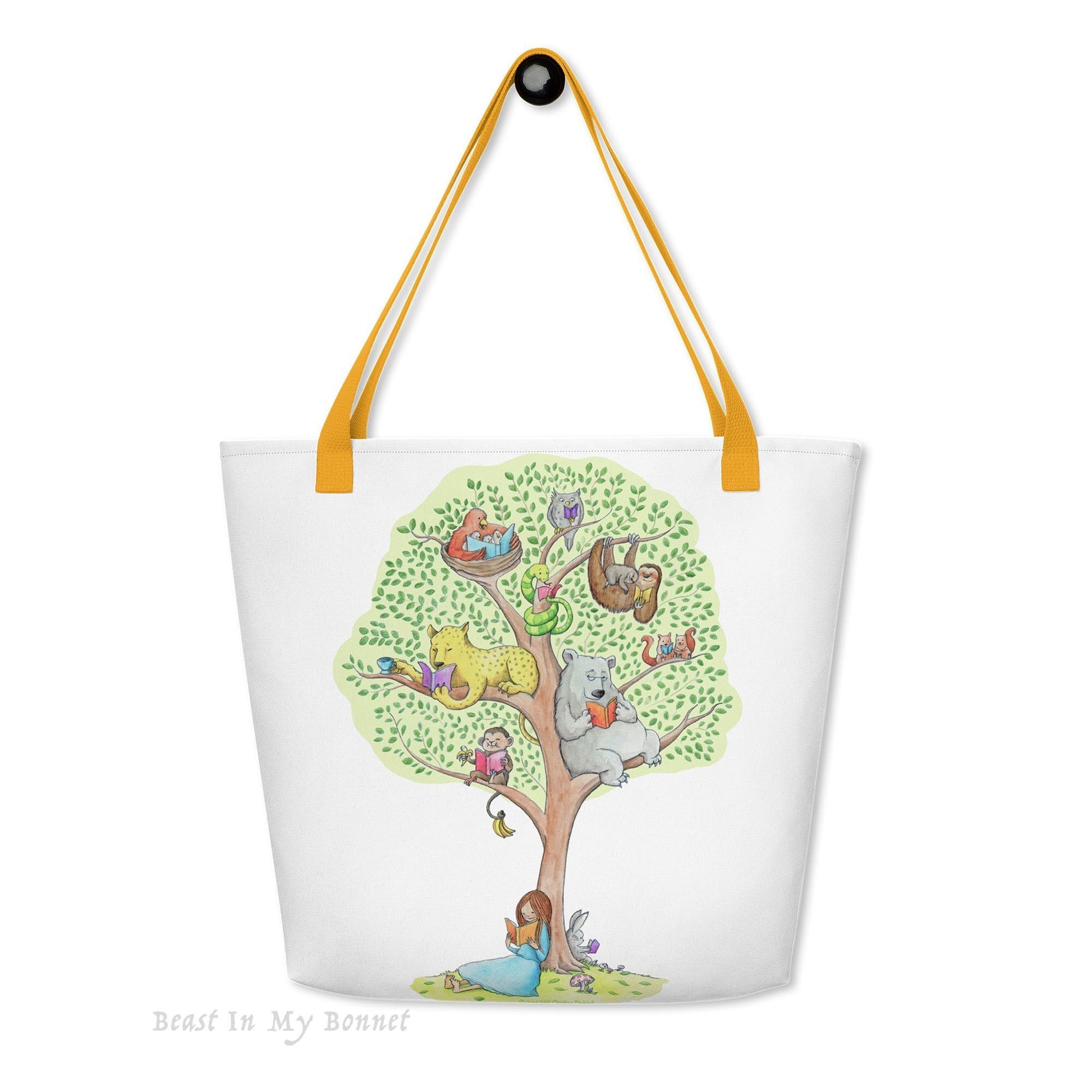 Book club is in session! This spacious tote bag features a colorful illustration on both sides showcasing a green leafy tree filled with cute animals happily reading. At the base of the majestic tree, a girl in a blue dress leans against the trunk reading her own book, while a rabbit friend enjoys reading nearby. Complete with a convenient inside pocket for organization that features its own cute illustration. With this large, erudite, tote you can carry 40lbs of your favorite books or your favorite 40lb little beastie to read them with.