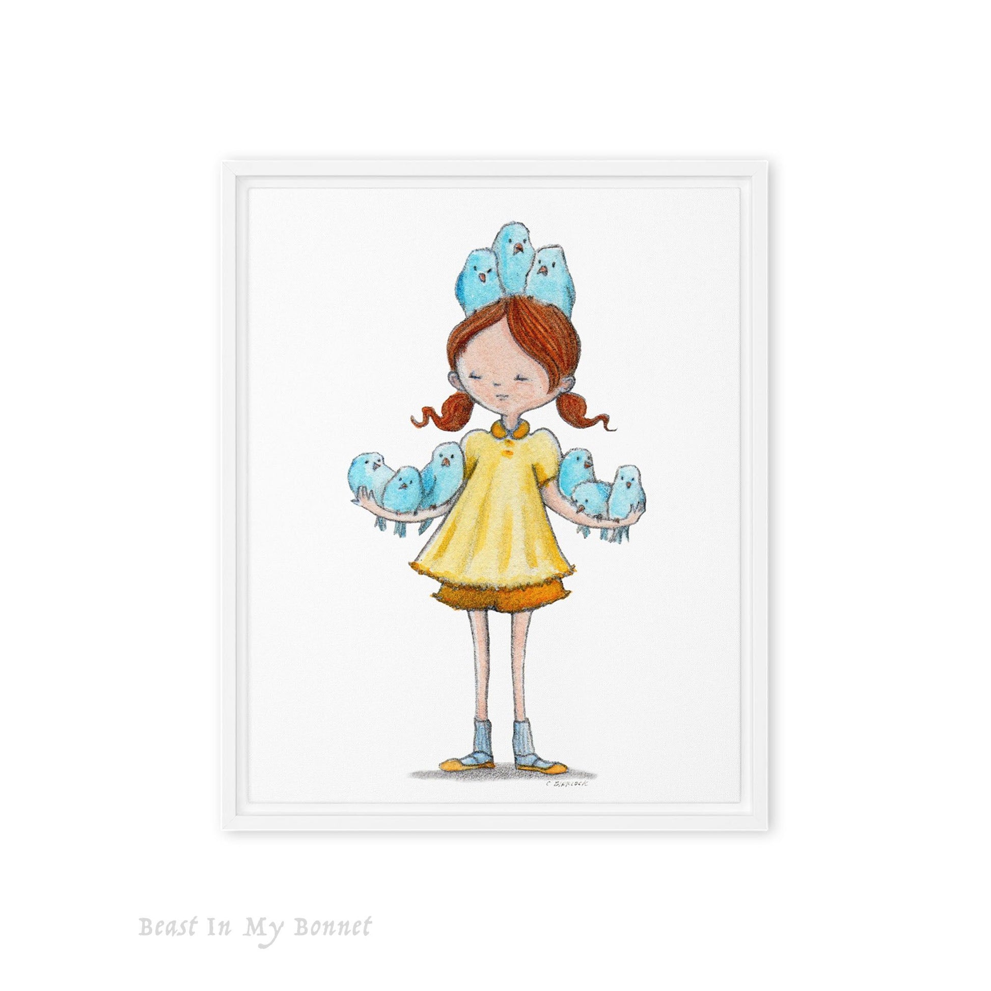 This enchanting 8"x10" framed canvas showcases a digital print of an original illustration of a red-haired girl in a bright yellow dress with her arms outstretched, adorned with adorable blue birds perched on her arms and head. The colorful, whimsical artwork brings joy and wonder to any room. This white pine wood framed canvas comes with rubber pads on the back corners and wall mount that makes hanging the artwork hassle-free.