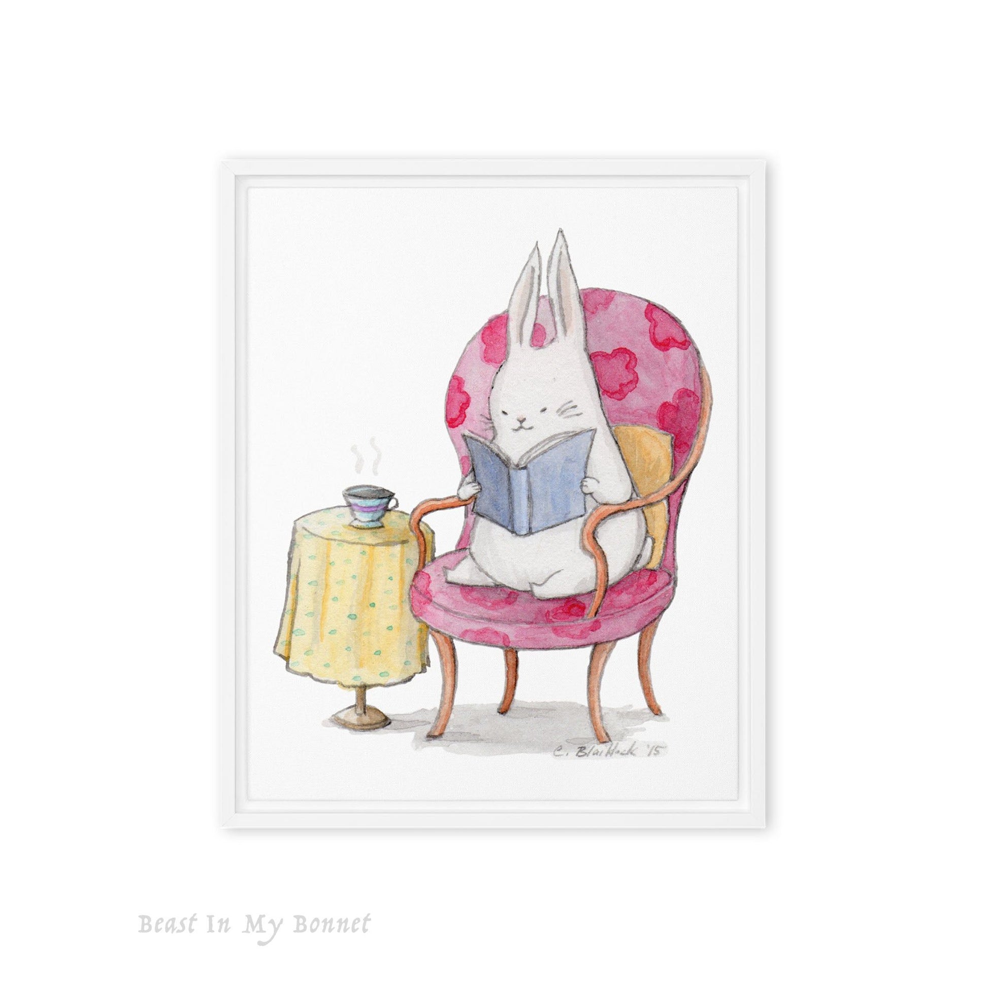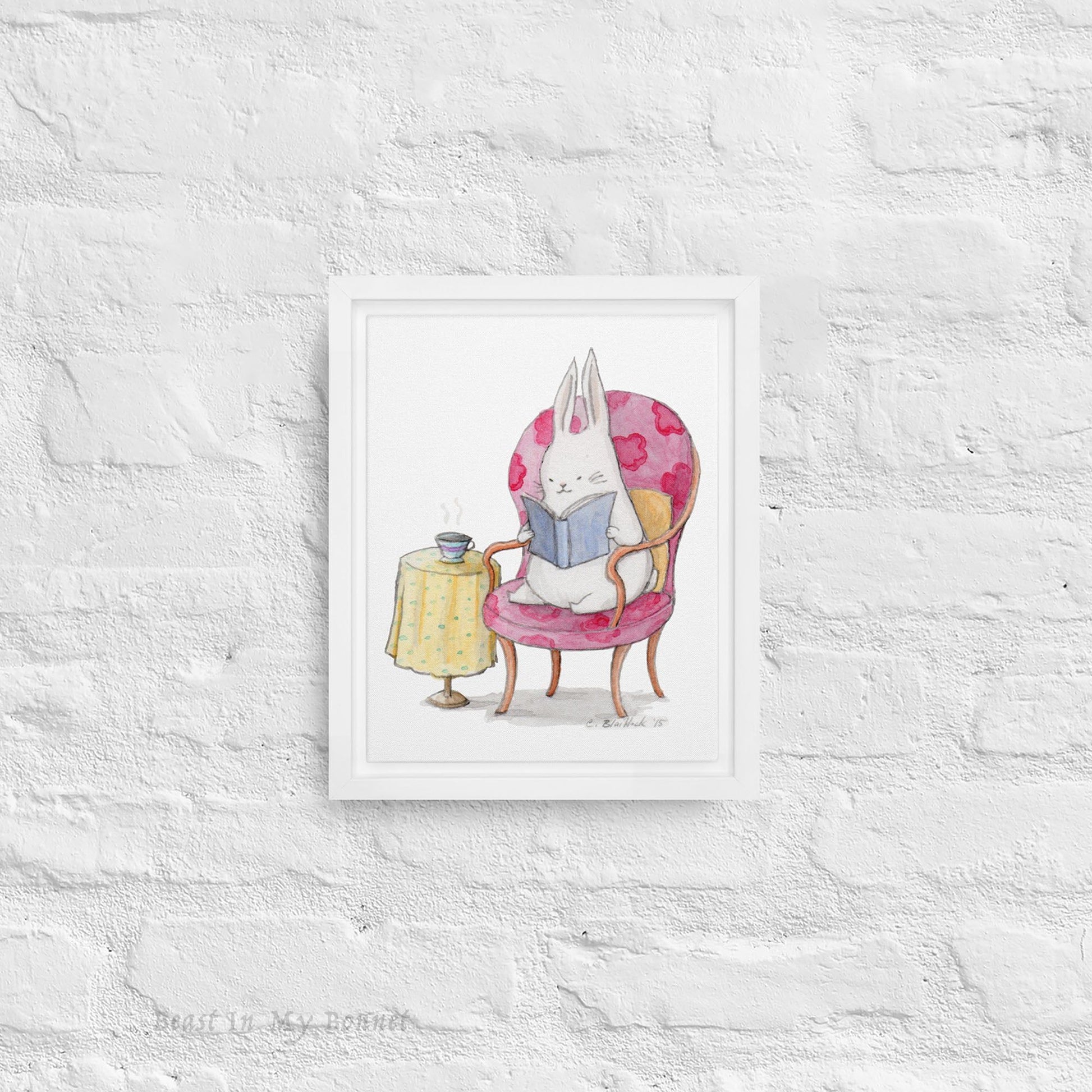 This delightful 8"x10" framed canvas features a digital print of an original illustration depicting a studious white rabbit enjoying a peaceful reading session in a plush red armchair, complete with a steaming cup of tea on a nearby table. This white, pine wood framed canvas comes with rubber pads on the back corners and wall mount that makes hanging the artwork hassle-free. The colorful artwork brings warmth and whimsy to any space.