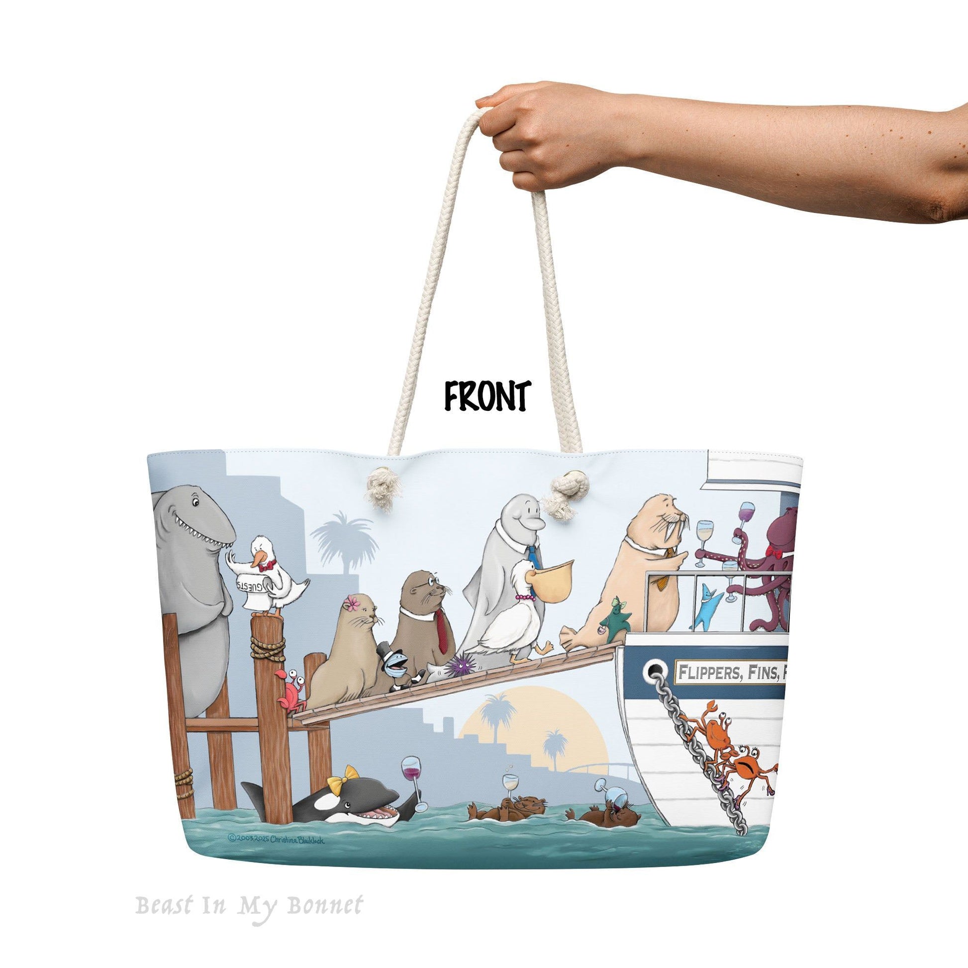 You are bound to receive a warm welcome anywhere you travel when you carry this delightful gang of seaside friends along with you. This roomy tote features soft rope handles, a wrinkle-free finish, and plenty of space for your essentials.