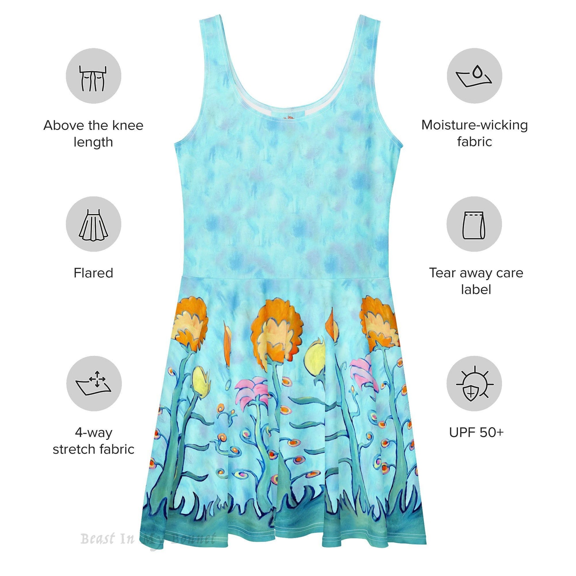 The smooth, elastic fabric on this sleeveless skater's dress is soft and comfortable. The flared skirt gives it an elegant twist that brings out the design with a beautiful vibrancy.