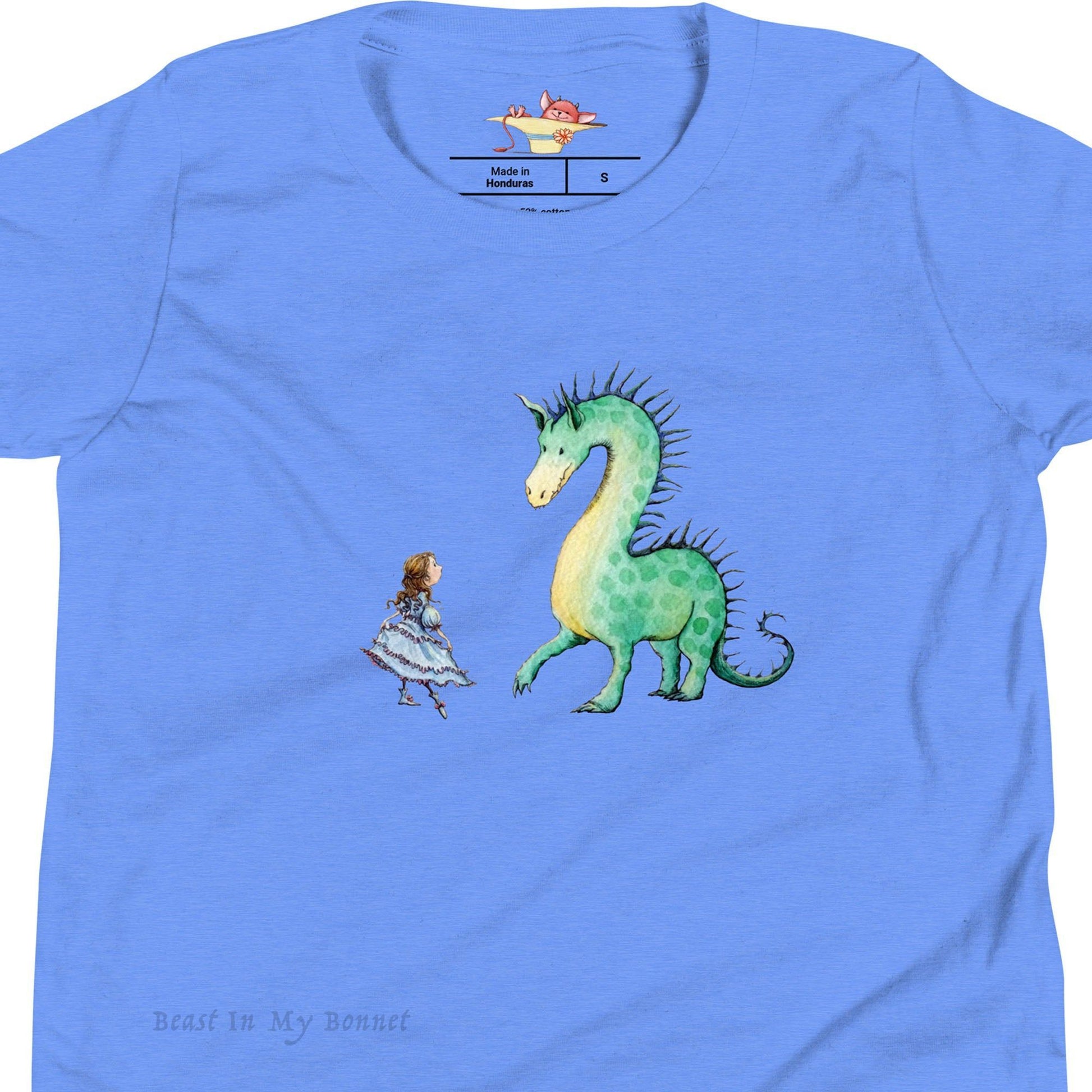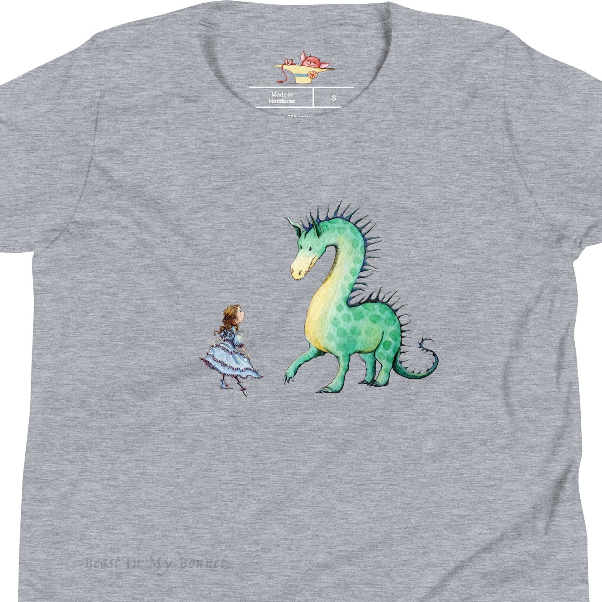 This enchanting youth tee shirt features an elegant, finely dressed girl bowing in a graceful greeting to a massive green dragon who nods graciously in return. The magical scene captures a moment of mutual respect and friendship - perfect for kids who love fantasy adventures and mythical creatures. This dynamic shirt is light, soft, and ready to become a favorite in your child's wardrobe.